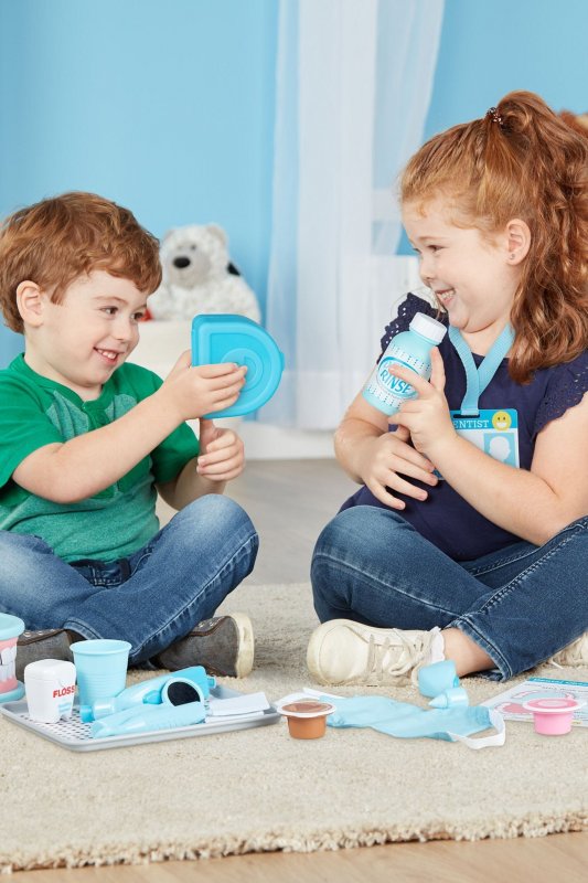 26-piece dental care play set features an over-sized set of pretend teeth so young dentists-in-training can give cleanings, treat cavities, and even fit retainers and braces!