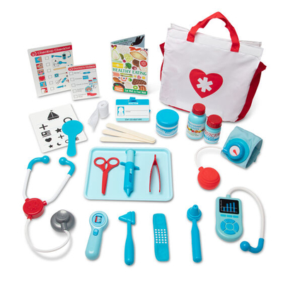 - Includes play stethoscope, blood pressure cuff, hearing tester, syringe, scissors, tweezers, rolling forehead thermometer, reflex hammer, otoscope, eye cover, tongue depressors, bottles, ID badge, activity cards, and more