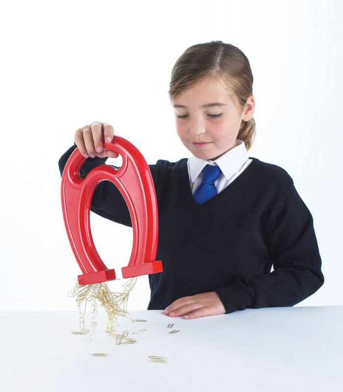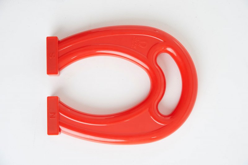 Powerful magnets (with North and South poles clearly marked) are housed at the ends of this impressive giant horseshoe magnet.