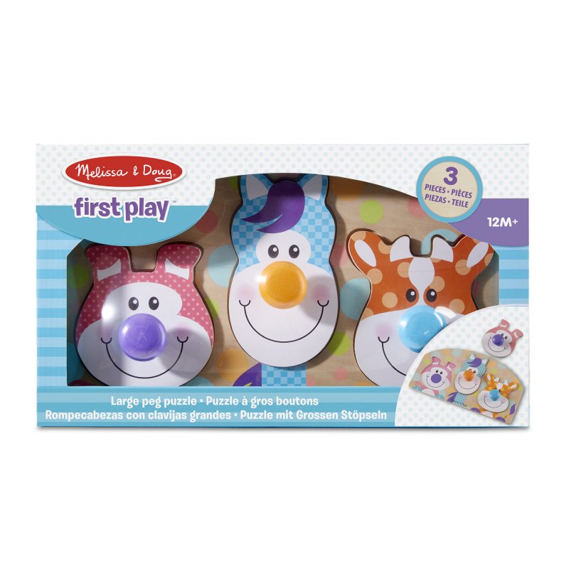 Little hands and big imaginations will love these friendly wooden farm animals with oversized noses! The smiling pig, horse, and cow have wooden knobs for noses that are easy to grasp. Babies and toddlers will delight in matching pieces to pictures on the sturdy wooden 135 cm by 20 cm puzzle board, discovering colours and patterns, and developing fine motor skills. First Play puzzles and toys feature bright colours, bold patterns, and whimsical designs that boost skills while sparking imagination and wonder—right from the start! |