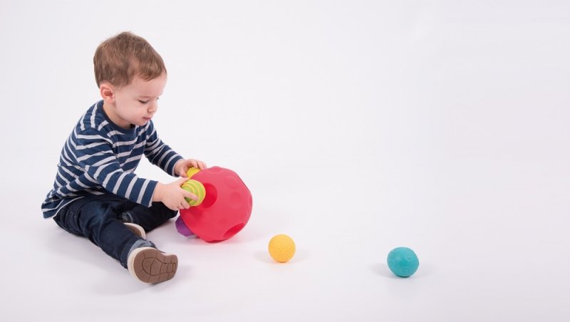 A large colourful textured ball with 6 smaller balls which fit into craters around the surface. An unusual and stimulating resource which can be used with infants to explore actions, reactions, and motor skills; or within a small group of toddlers to encourage conversation and develop hand-eye coordination. The small balls have differently textured surfaces and can be removed and used separately.Size: approx. 185mm dia.
