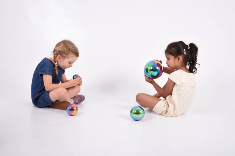 This set includes 4 multi-colored, reflective, stainless steel balls for multi-sensory and gross motor activities. The stunning, iridescent, mirrored surface provides a slightly distorted reflection and fascinates children while encouraging descriptive language. The reflective surfaces change colors in the light as children move the balls. Sensory Reflective Balls are made of durable, tarnish-resistant stainless steel. They are chemical-free, seam-free, non-porous and hygienic. The balls are hollow which makes them lightweight and easy for small hands to manipulate. Use the Sensory Reflective Balls indoors or out, or to provide a focal point for displays. Suitable for all ages. Sizes: 2.4”, 3.1”, 3.5” and 5.9” dia. |