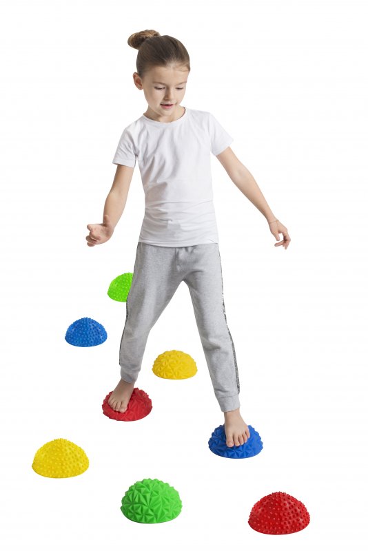 Set includes 4 domes with a bumpy surface and 4 domes with a sensory triangle surface.