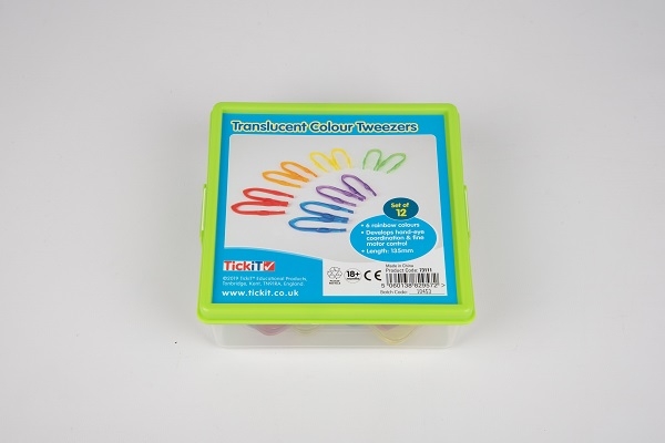 Bright fun tweezers, great for exploring colour through light and an ideal size for children to manipulate. Use for picking up small counters in sorting or patterning activities, to improve finger and hand strength, develop coordination skills and learn about colour mixing. Includes plastic container for convenient storage.